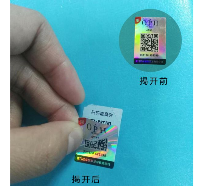 通過這款揭開式雙層防偽標(biāo)簽,顧客可以通過掃描表層的二維碼查詢到客戶給予代理商的授權(quán)書,然后再揭開標(biāo)簽,掃描底層的二維碼可以查詢真假,而且底層的質(zhì)料也具有防轉(zhuǎn)移效果,貼上去后不能再撕下來進(jìn)行二次運用。